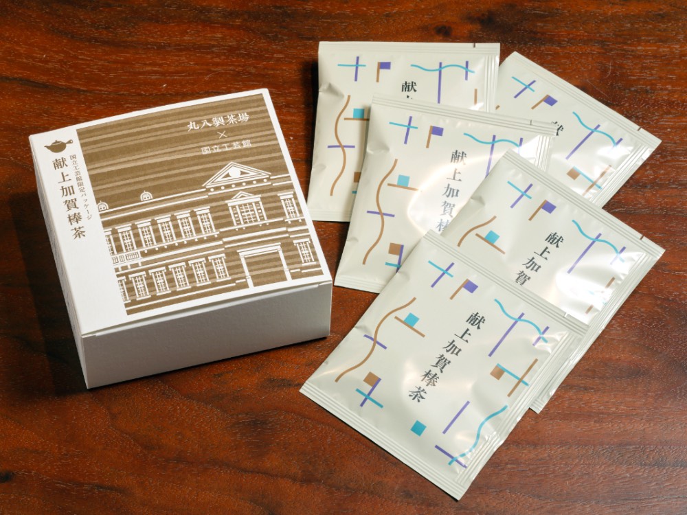 香り高い丸八製茶場の「献上加賀棒茶」。国立工芸館限定パッケージで個別包装となっているため、来館の記念にも、お土産にもぴったり。