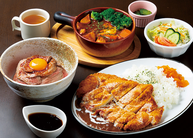 ●ローストビーフ丼1,200円、煮込みハンバーグセット1,300円、チキンカツカレーセット1,000円など食べごたえのある料理を提供。