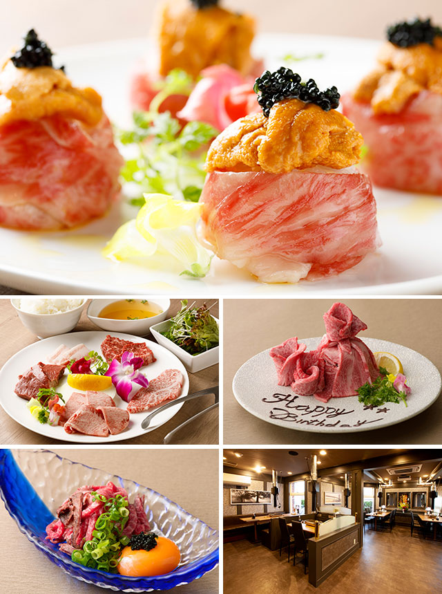 ●平日限定・和牛のウニ軍艦2,138円、サーロインの焼きすき2,138円、極上赤身のローストユッケ1,296円、カルビ961円、国産せせり518円