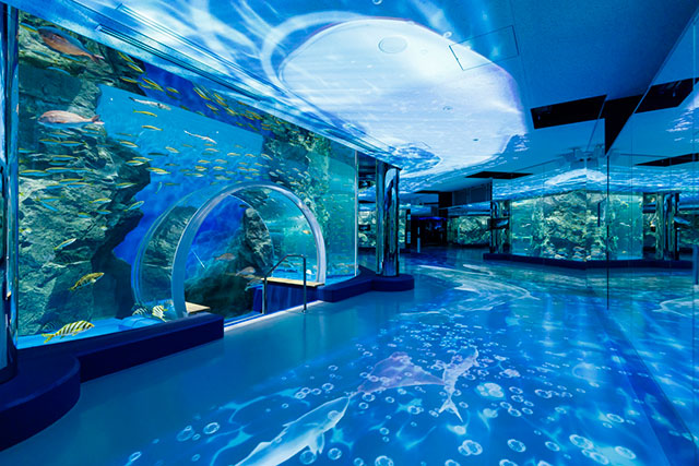 「ジンベエザメ館 青の世界」には、体長約5メートルのジンベエザメをはじめ、アカシュモクザメ、イサキの群れ、エイの仲間などを展示。イルカとのふれあいや、ペンギンの散歩、クラゲの光アート、イルカ・アシカショーなども行っている。