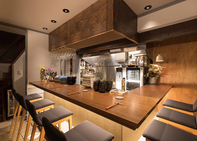 スタイリッシュな中に金沢らしさを演出した空間で、北陸の食材を活かした創作料理を提供する注目店。和洋の垣根を越えて独創性に富んだメニューは、ワインや日本酒など自由に合わせて、お箸で気軽に楽しめる。和洋、新古が入り混じる個性豊かな一軒だ。