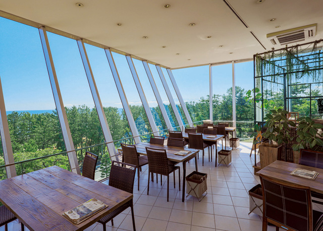 世界的建築家・長谷川逸子氏が設計した、氷見市海浜植物園の展望階のカフェ。海側にせり出した4階部分の窓際に立つと、まるで宙に浮かんでいるように感じる。傾斜のある壁はガラス張りで、一方には立山連峰が浮かび上がる青い海と空、別方向にはのどかな田園風景や植物園の見事な中庭を臨むことができ、それぞれの席ならではの景色がゆったりと楽しめる。