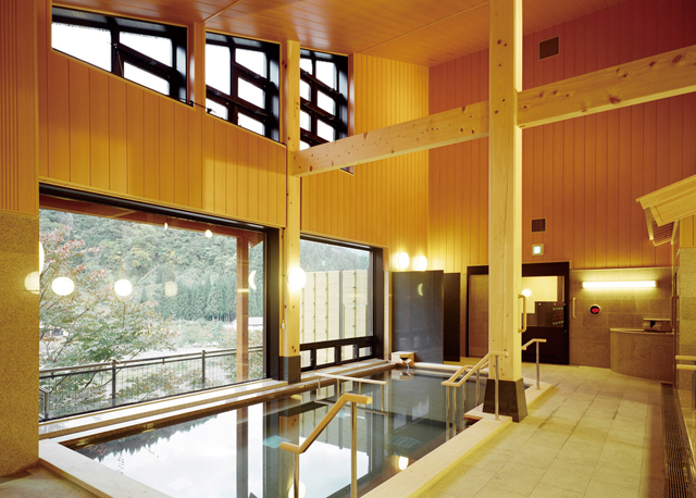 特徴的な古民家が多く残り、ウインタースポーツスポットや雪だるまの里としても有名な白峰地区。全国でも数少ない純重曹泉である白峰温泉は、肌についた皮脂汚れや古い角質を落とす作用により、肌をなめらかにし皮膚の炎症を和らげるとされ、「絹肌の湯」として評判だ。そんな湯を手軽に楽しめる総湯では、肌さわりの良い柔らかな湯につかりながら大自然を感じられるのが醍醐味。大浴場からは、裏手に流れる手取川が臨める。