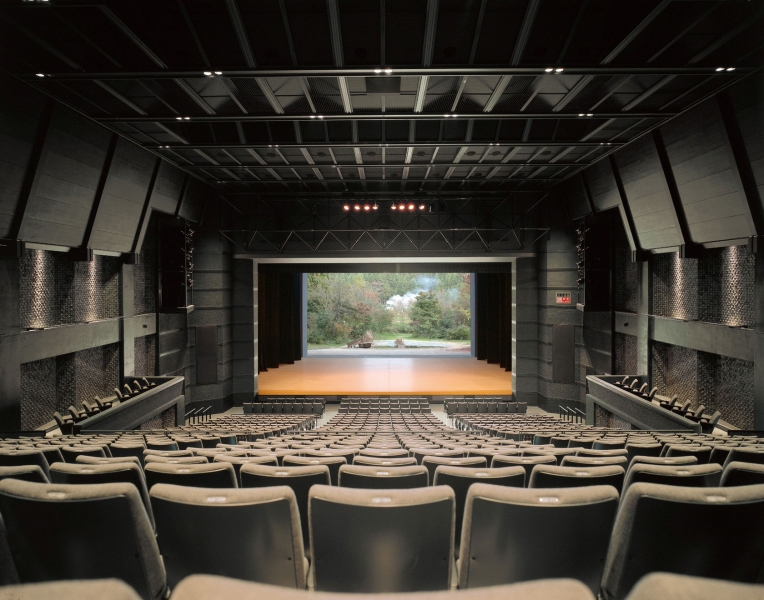 仲代達矢さん(無名塾)が監修を務め、演劇に必要な諸設備を備える『能登演劇堂』。舞台奥の扉が開き、背後の自然もステージと一体になる演出を可能としたプロセニアムステージ形式のホール。