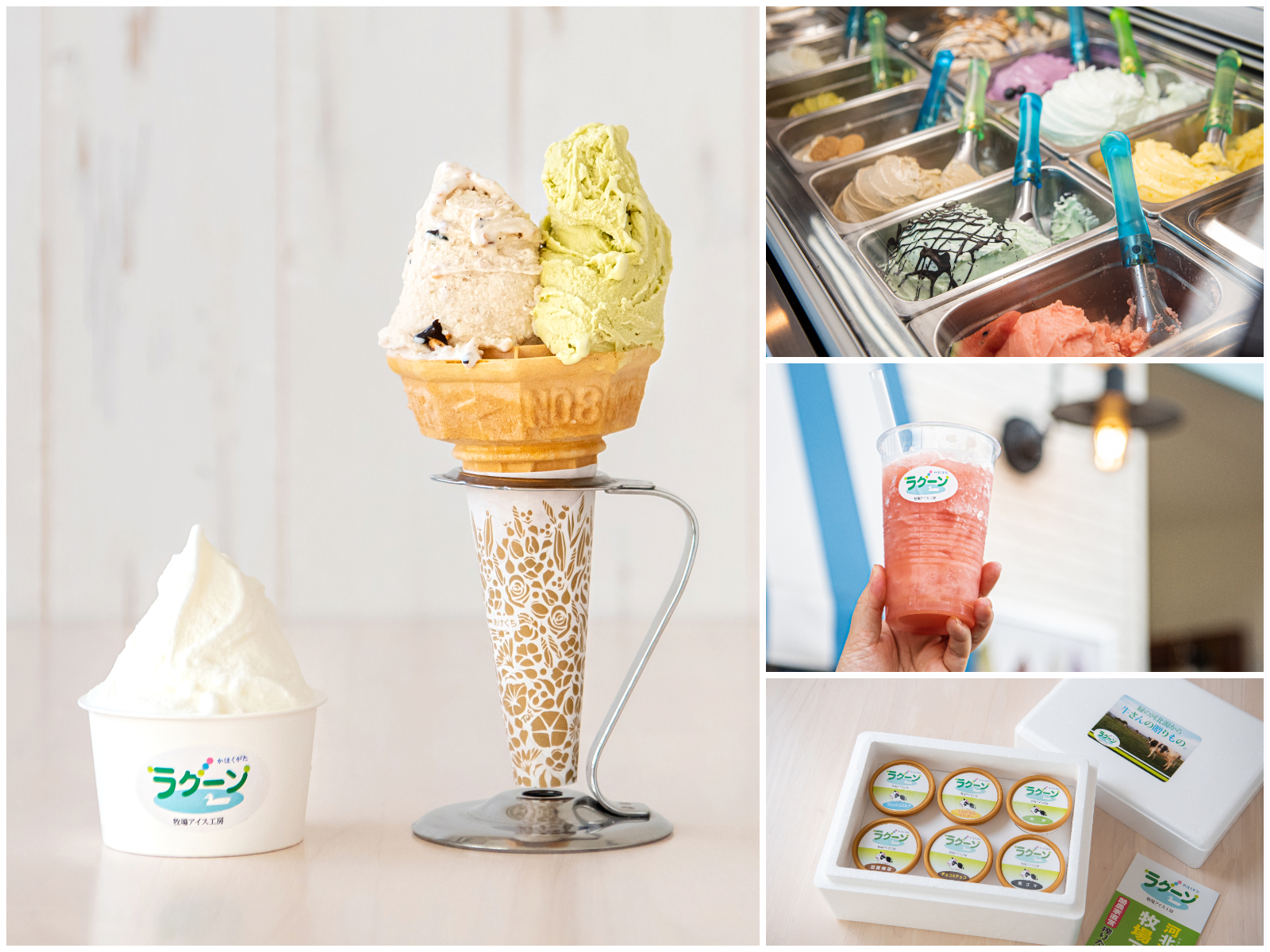 津幡町にある『牧場アイス工房 ラグーン』のアイスクリームはいずれも甘さは控えめ、さっぱりとした口溶けだ。牧場直送の新鮮なミルクが際立つピュアな味わいの「フレッシュミルク」や旬の果物のフレッシュな味わいを活かしたフレーバーが常時10種類以上並ぶ。