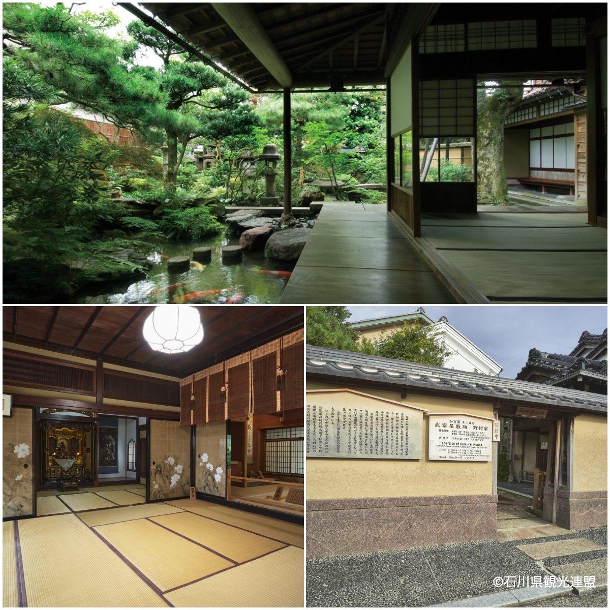 藩政期に加賀藩の上中級武士が暮らした長町武家屋敷跡は、石畳や土塀、長屋門など、往時の面影が今も色濃く残る金沢屈指の観光エリア。その界隈で唯一『武家屋敷跡 野村家』が一般に公開されている。敷地は代々前田家の奉行職を歴任してきた加賀藩士・野村伝兵衛信貞の屋敷跡。武家制度の解体を受け、土塀や古木、曲水の一部を残し、館は取払われた。その後、「北前船」船主であった久保彦兵衛が藩主を招いた豪邸の「謁見の間」「上段の間」を移築し、現在に至るという。加賀藩のお抱え絵師であり、狩野派の最高峰・佐々木泉景(ささきせんけい)によって「上段の間」に描かれた襖絵や野村家伝来の刀剣、甲冑等は必見だ。