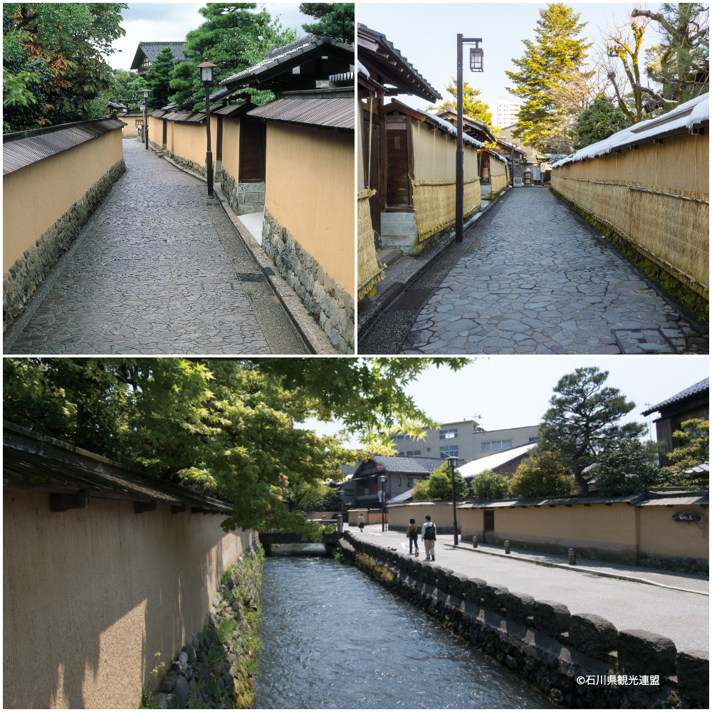 城下町・金沢らしい土塀や石畳の小路が残る『長町武家屋敷跡界隈』。藩政時代には中流の藩士の屋敷が軒を連ねており、伝統環境保存区域および景観地区に指定。今でも趣のある景観が維持されている。江戸時代に作られた古地図のままの町割りが続いており、まるでタイムトリップしたかのような気分で街歩きを楽しめる。土の壁が剥がれるのを防ぐために毎年行われる「こも掛け」は、金沢の冬の風物詩としても知られる。春は桜、夏や秋には土塀越しに見える庭木の新緑や紅葉など、季節を感じながらの散策は疲れるどころか、逆に元気が湧いてくる。界隈を清らかに流れる「大野庄用水」は、かつては木材の運搬に使われ、金沢城の築城にも大きな役割を果たしたという。武士の暮らしが垣間見える貴重な建物を訪れたり、和スイーツやソフトクリームを楽しんだり、カフェでホッと一息ついたりと、自分のペースで心地よく過ごせるとあって、地元の人にも観光客にも人気のスポットだ。