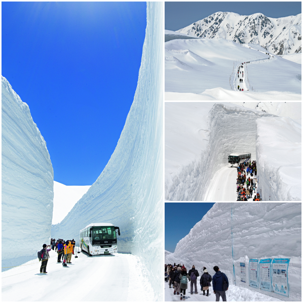 左/雪の大谷ウォーク、右上/パノラマロード、右中/雪壁の間を歩行できる、右下/雪のカレンダー。