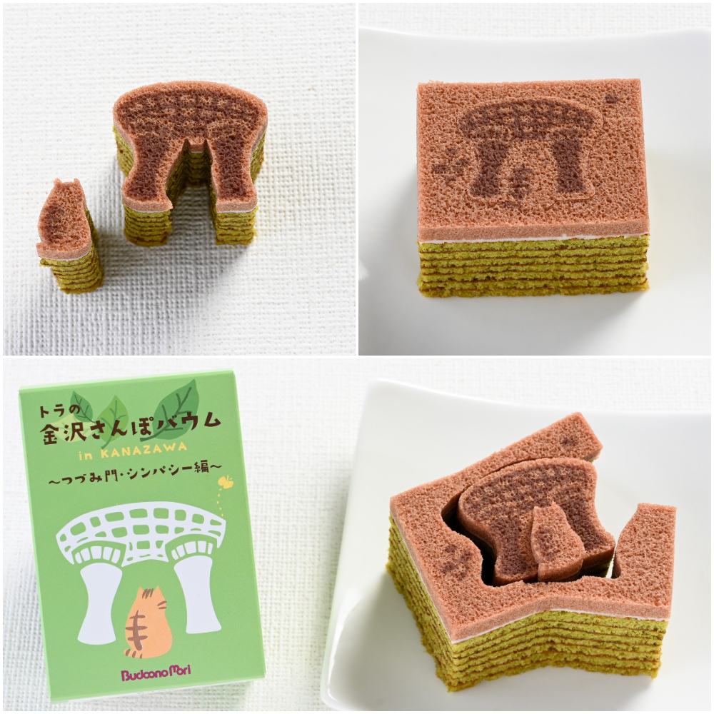 金沢市北部にある『ぶどうの森 本店』。自然あふれる広大な土地に並ぶ、ぶどう園、洋菓子工房、カフェレストランなどで多くの人を笑顔にしてきた。そんな同店がお菓子作りで大切にしているのが「美味しいこと、美しいこと、物語があること」。今回新商品として発売された「トラの金沢さんぽバウム in Kanazawa ~つづみ門・シンパシー編」は、愛らしさたっぷりの新作となっている。7層の抹茶バウム生地に、ココア風味ケークを重ねた四角い形のバウム菓子。天面には金沢駅のシンボルつづみ門と、それを見つめるにゃんこトラが描かれている。シルエットに合わせて切れ目が入っているので、可愛らしいにゃんこトラをゆっくりと外してみよう。今回の味のポイントにもなる抹茶は、金沢竪町の老舗『野田屋茶店』のものを使用。ほんのりと苦みのあるふくよかさが特徴だ。当面販売は「金沢百番街店」のみの予定。金沢駅利用の際には、足を運んでみよう。