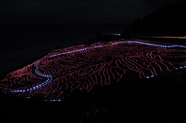 田のあぜ道に並べられた21,000個ものソーラーLEDが夜の千枚田を美しく彩るイルミネーションイベントで、全て太陽光のエネルギーでまかなわれおり、世界的にも珍しく、ギネス世界記録(TM)に認定されています。