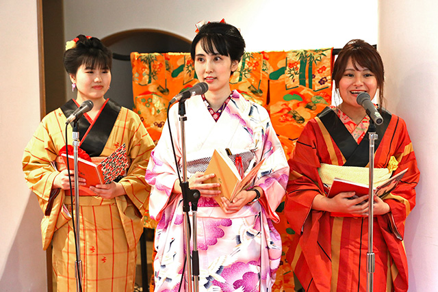 当日朗読されたのは、夢二の詩「たもと」「つらつらつばき」、夢二の童話「夜」など。フリーアナウンサー・松岡理恵さんと金沢大学放送局Web-KURSの3人の息のあった朗読を聞き入りました。着物姿の人に読んでもらうと、作品のあたたかさをより深く感じました!
