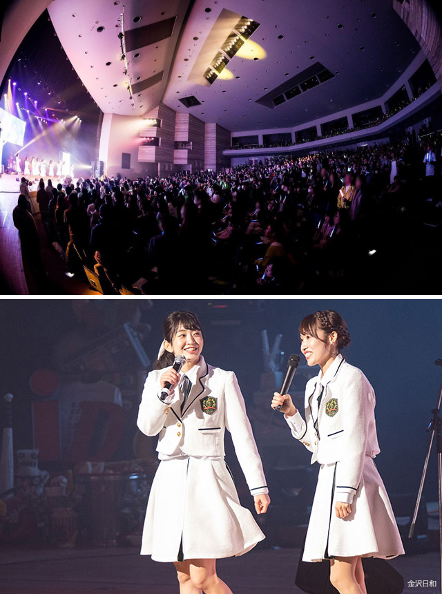 上/当日券をふくめて1,033人が金沢市文化ホールで満員に。下/校章と制服を紹介する松井祐香里さん(左)、宮村優希さん(右)。今回のライブ後の「かがやき投票」で1位、2位の2人。