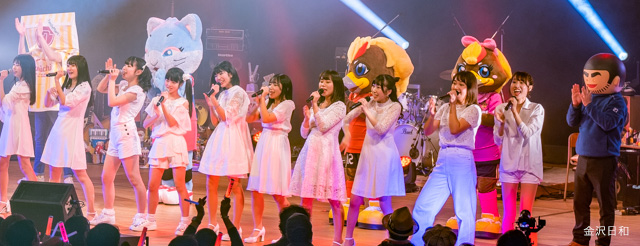 今回のライブの壇上に、各プロスポーツチームのマスコットに加え、ファミリーマートのゆるキャラ「ファミチキ先輩」も登場する一幕も。各プロチームの応援ソングを熱唱。