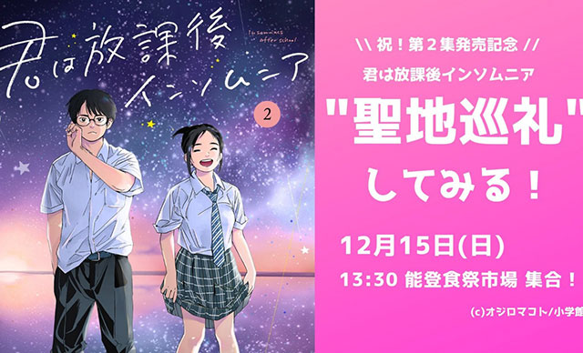 青春漫画の旗手としてヒット作が続くオジロマコトさんの作品です。高校生の主人公の鬱屈とした日々や、ヒロインとの恋愛が能登を舞台に描かれていきます。タイトルにある「インソムニア」とは不眠症のことで、物語の中には夜眠れない悩みをかかえた高校生、中見 丸太(なかみ がんた)が、同じ悩みをかかえたヒロインの曲 伊咲(まがり いさき)と七尾の夜の街を徘徊し、尾湾橋の上で思わぬ夜景に出合うシーンも登場します。