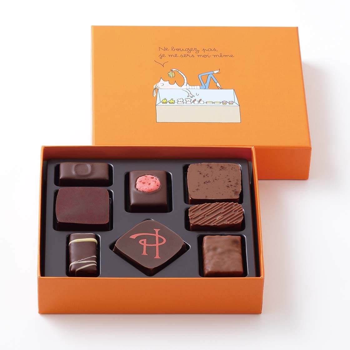 フランス国家最優秀職人章の称号を持つシェフ、ニコラ・クロワゾーの専門店。グァバとマンゴーのピュレを加えたライム果汁を用いたガナッシュ「マング&グァバ」、ピスタチオとゲランド塩の結晶が入った「プラリネ ピスタッシュ」、レモンピールとジンジャー風味のアーモンド&ヘーゼルナッツのプラリネ「シトロン&ジャンジョンブル」の期間限定フレーバー3種と定番人気のダークガナッシュを詰め合わせた。