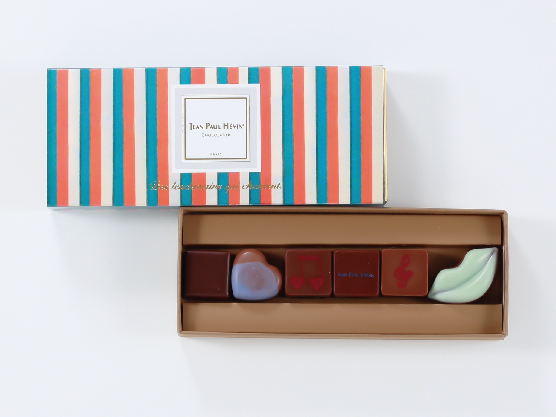 国際コンクール優勝やフランス国家最優秀職人章MOF受章など、輝かしい経歴を持つジャン=ポール・エヴァン。ショコラは品質管理のため、厳密な冷蔵管理のもと毎週パリから空輸している。今年のバレンタインコレクションのテーマは「明日への希望を歌おう」。パッションフルーツとココナッツジュースのガナッシュ「ラブ ロック」など、音楽をモチーフにした限定のボンボンショコラ4個を含む6個の詰め合わせ。