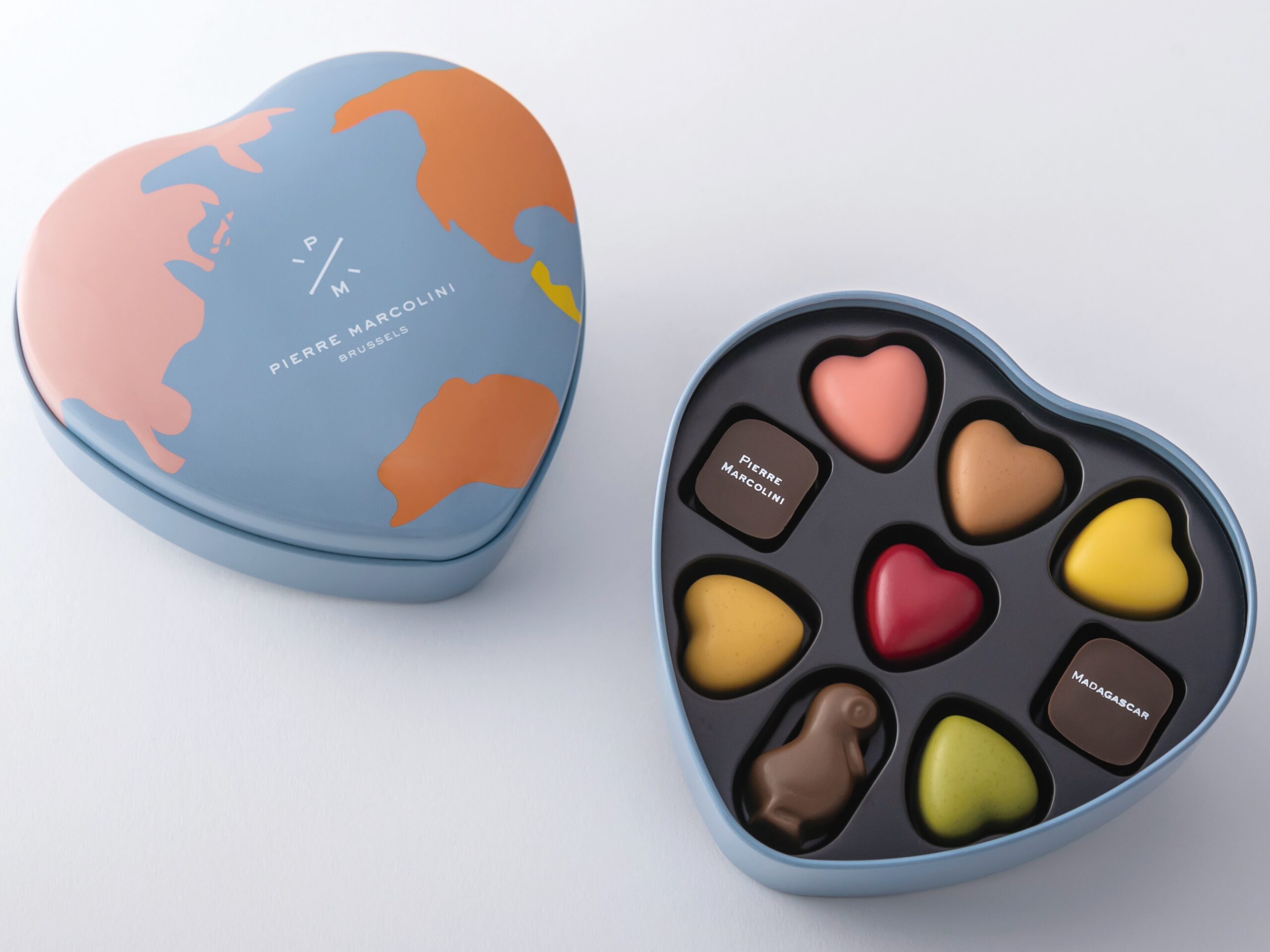 ピエール・マルコリーニは、カカオ豆の選定からチョコレートの製造までの全ての過程を自ら手掛ける「Bean to Bar」の先駆者。こちらの商品は、ハートの形と色合いが可愛い「クール フランボワーズ」をはじめとする6種類のクールシリーズに、代表的な「ピエール マルコリーニ グラン クリュ」やキャラメルソースが入った「アニモ キャラメル」など個性の異なるプラリーヌを詰めた期間限定のアソートだ。