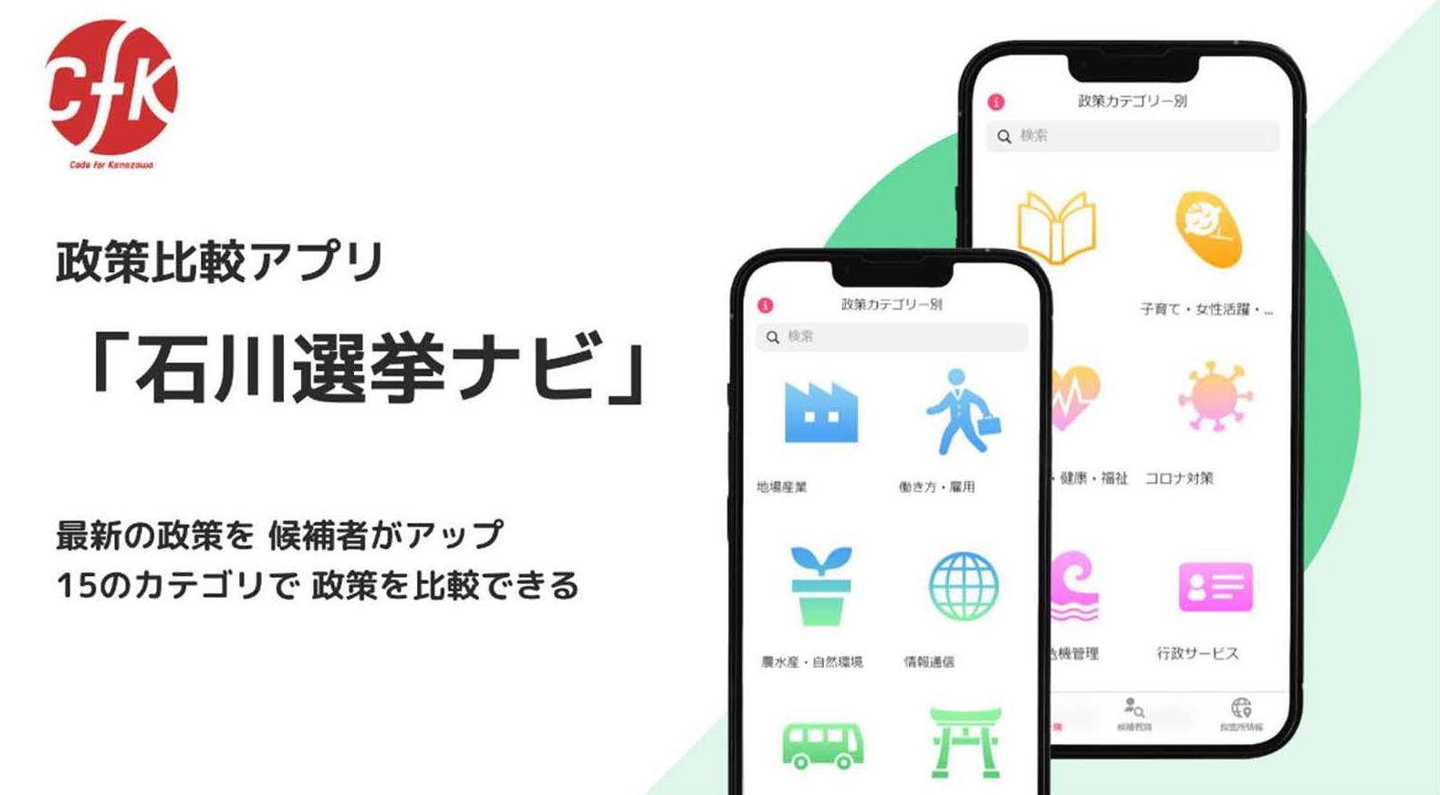 「石川選挙ナビ」は、石川県知事選の立候補予定者の政策をわかりやすく表示するアプリ。有権者は、地場産業や働き方・雇用、コロナ対策、行政サービスといった15の分野の政策を比較でき、政策は各候補者自身が随時更新する仕組みだ。