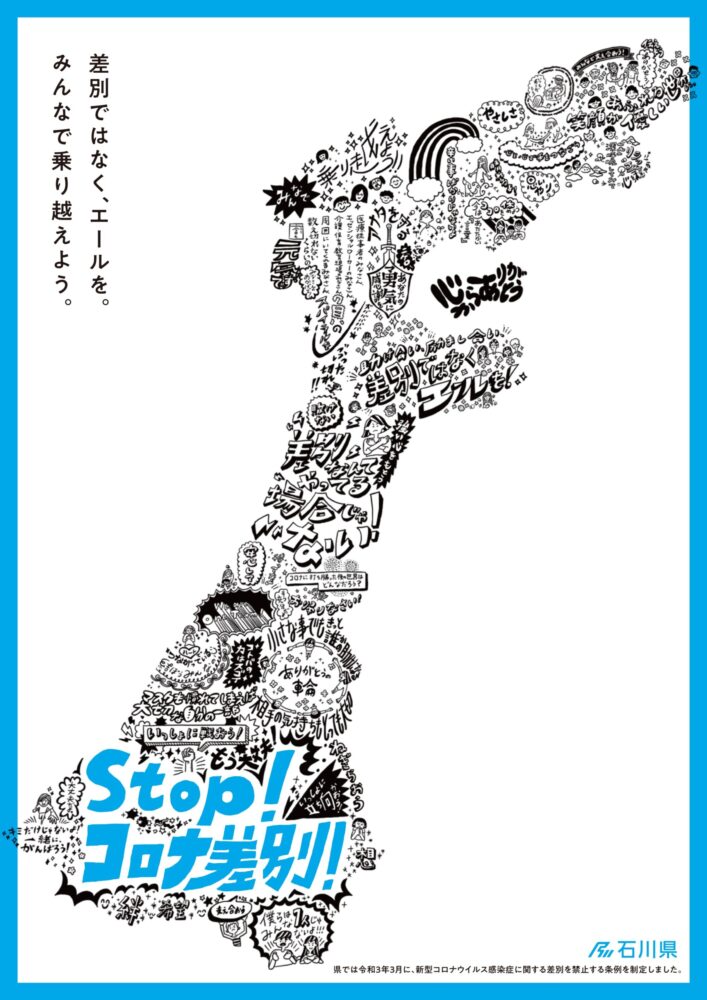 石川県では、令和3年3月に「コロナ差別を禁止する条例」を制定し、「Stop!コロナ差別!」のメッセージを伝えるポスターを作成。「差別ではなく、エールを!」や「みんなで乗り越えよう」などの前向きなメッセージをたくさん組み合わせて、石川県の形に仕上げたデザインとなっている。このポスターを県内市町や学校、スーパー、企業等に配布することにより、コロナ差別を許さない県民意識の醸成を図ることを目的としているという。また、インターネット上のSNSや匿名掲示板などでのコロナに関する差別的な書き込みについて、AIを活用して幅広くチェック。収集した情報は石川県が保管しており、差別等の被害を受けた人が投稿の削除依頼や法的手続きを取る際の証拠として活用できるよう、被害者の求めに応じて提供するのだという。
