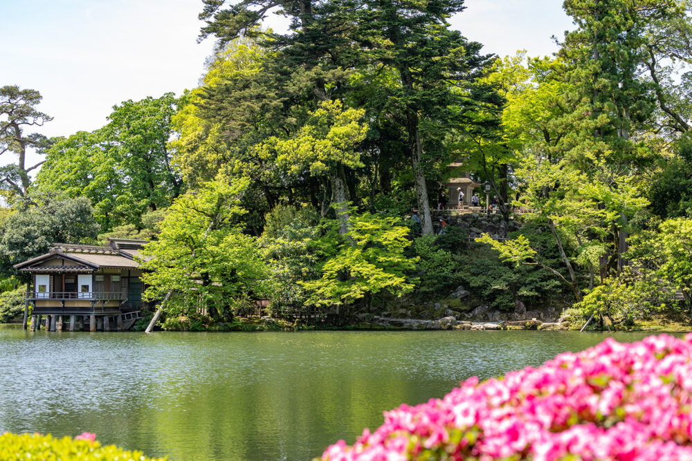 兼六園の中心部に位置する霞ヶ池(かすみがいけ)を一望できる栄螺山(さざえやま)。高さは約9m、周囲約90mで、時計回りに3周の道が山頂まで続きます。これは加賀藩13代藩主・前田斉泰(なりやす)が霞ヶ池を掘り下げた時に出た土を使って、今でいうところの3Rのリデュースの発想で作られた築山です。エコで、しかもこのような優美なものを作ってしまうのは、さすがですね。