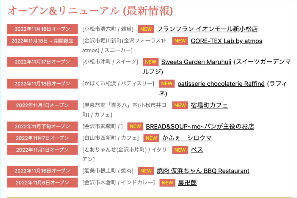 石川県の新店&リニューアル&ポップアップ情報を紹介している「NEW OPEN」。今週も石川県内の話題のお店情報を続々更新しています。11月のオープン情報掲載件数はなんと55件以上! 新店LOVERの皆様、ぜひチェックしてくださいね☆