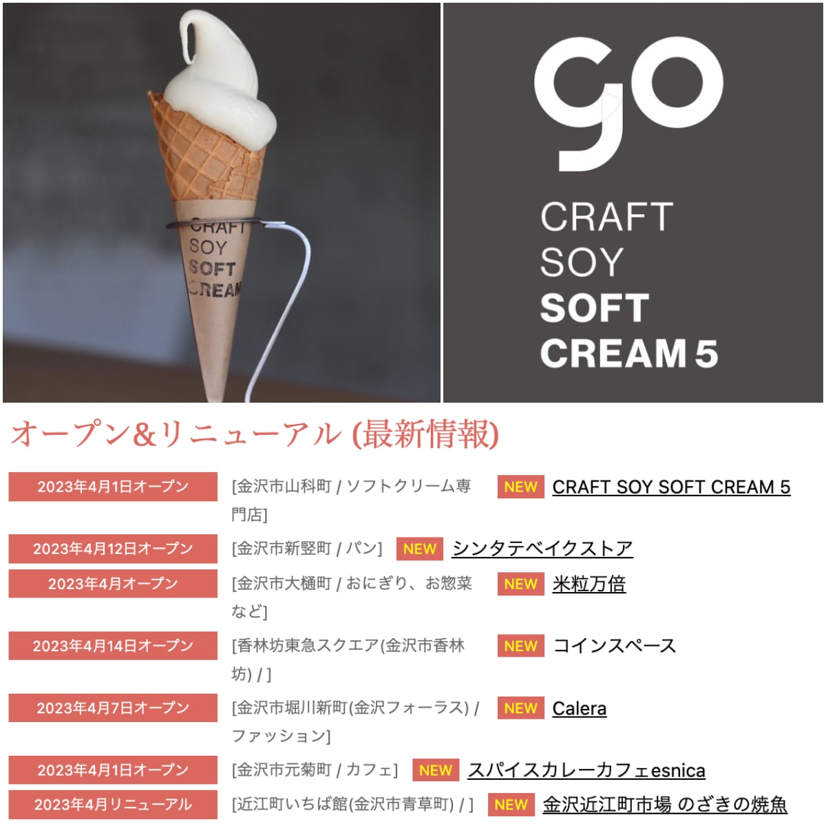 4月頭は、尾張町にオープンの『カレー処 ビンダース』、長町のイタリアン『Loto(ロート)』などグルメ系のオープンやリニューアルがあります。昨日1日(土)金沢市山科に『CRAFT SOY SOFT CREAM 5』がオープンしました。世界一のソフトクリームを金沢に届けたいと消防士(救命士)と介護福祉士を脱サラした二人が始めた注目のお店。看板メニュー「Kinaco」は牛乳や卵、上白糖を使わずに豆乳をベースにしているそうです。白ごまで仕上げた超濃厚なソフトクリームは子供から大人まで楽しめますよ♪