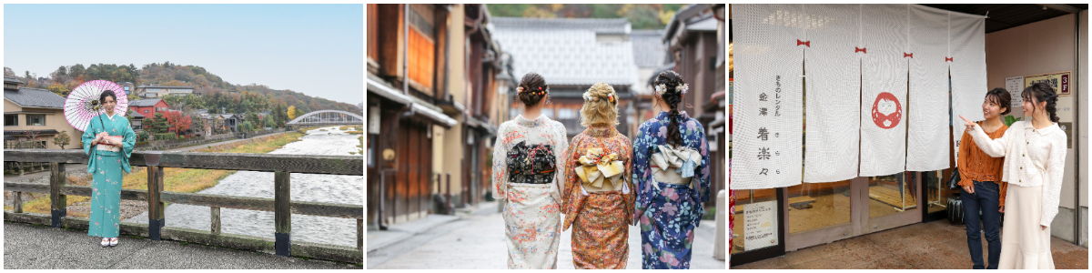 そこでおすすめなのが現地で気軽に着付けを行ってくれるレンタル着物。中でも『金澤 着楽々(きらら)』は駅前、ひがし茶屋街、尾山神社といった金沢の主要な観光地の近くに3店舗を構えるため、利用しやすいと評判だ。