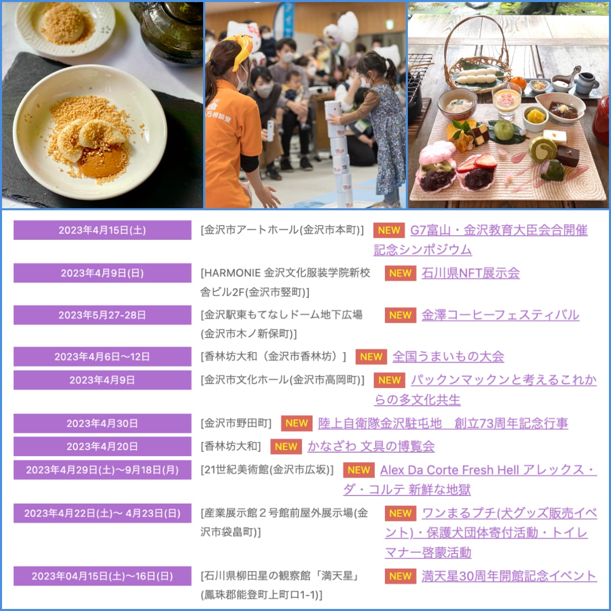 なお、4月中旬から5月末までに石川県内にて開催される祭りやイベント、キャンペーンなども、文字情報にてどんどん追加更新されています。家族や友達みんなで楽しめそうなイベントが目白押しですので、週末やお休みに「どこ行こうかな」と迷ったら、ぜひ「New Event」をチェックしてくださいね。