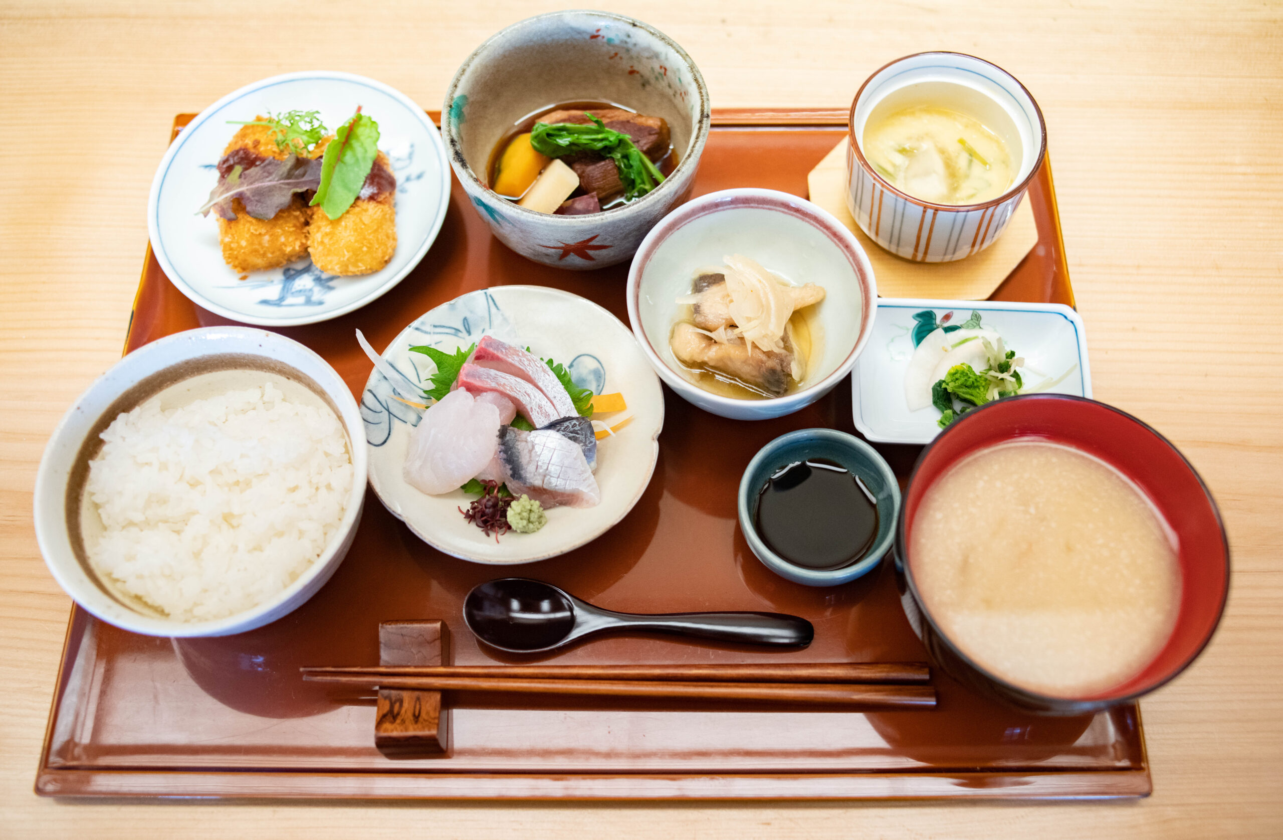 この日の日替わりランチは、ヒラメやイワシ、ヒラマサの造りや能登豚の角煮、ベニズワイガニのクリームコロッケ、輪島フグの羽二重蒸しなど地元の旬の食材をふんだんに使用した料理が並ぶ。
