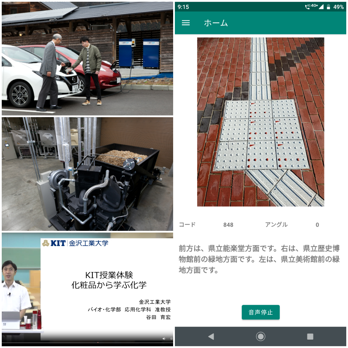 「社会実装」の事例はここでは紹介しきれないほどの数があるが、近年注目を集めるのが、「地域GX(グリーントランスフォーメーション)共創プロジェクト」である。カーボンニュートラルの実現に向けた様々な試みの中でも、電気エネルギーを取り巻く環境は、再生可能エネルギーの導入や電気自動車の普及によって大きく変化しようとしている。白山麓キャンパスでの実証実験の成果を踏まえ社会実装へと発展させていくプロジェクトをNTTアノードエナジーとの共同で「直流スマートグリッド事業」を2022年からスタートしている。その他にも、通常の点字ブロックに色を付けこれをスマホのアプリで読み込むことで視覚障碍者の方に周囲の情報を音声での提供や、外国人観光客に向けて観光情報を提供する「コード化点字ブロック」の実装などもある。(金沢市中心部にて敷設。)