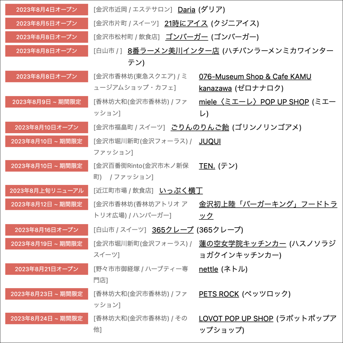 【8/27(日):今週のNEW OPEN】石川県内の新店舗まとめ☆