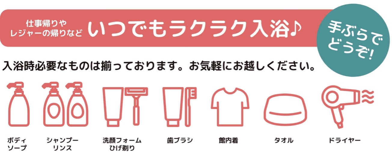 天然温泉・露天風呂、岩盤浴、お食事処、リラクゼーション、リクライニングルーム、コインランドリー、麻雀、カラオケ、個室時間貸し、キッズコーナー全室LAN完備