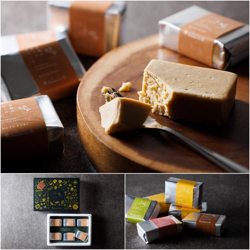 四角いテリーヌ型で焼いたシンプルな形状が美しいチーズテリーヌは、スフレチーズケーキ、バスクチーズケーキに次いで今注目のスイーツ。「山の中にある小さな工房で、こっそりと働く小鳥のパティシエが作ったこだわりのチーズテリーヌ」という物語を想像して作られており、小鳥がチーズテリーヌを運ぶ姿が描かれたパッケージを目にすれば、思わず笑みがこぼれるだろう。心を尽くして丁寧に作られたスイーツは、手土産としても年末年始のギフトとしても喜ばれること請け合いだ。「能登栗」の他、「プレーン」、「抹茶」、「チョコレート」の全4種類。オンラインショップでは冷凍での配送となるので、解凍すれば出来立ての風味が楽しめる。遠方への心を込めたギフトにも最適だ。ぜひ味わってみてほしい。