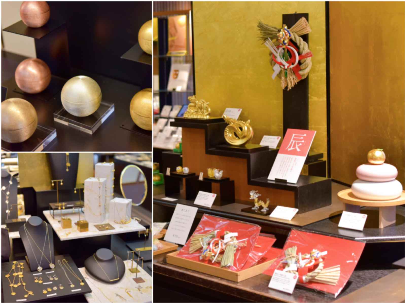 グループとして、今年で70周年を迎えた『箔座』は、箔の製造・開発のほか、箔の在り方を考え続け、まだ見ぬ様々な「箔のかたち」を提案しています。日々の暮らしの中に箔があることで豊かになれるよう、器、インテリア、アクセサリー、コスメ、料理用金箔など幅広い箔加工製品も取り揃えています。お正月には、開くと料理用金箔がきらりと舞う「ぱっきん箸」や、干支の辰のモチーフに金箔をあしらった飾りなど様々な商品があるので、華やかな「箔座の縁起物」で楽しいお正月を過ごしたら、きっといいことがありそうですね。