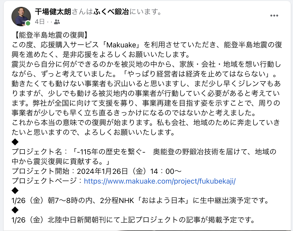 【能登応援】115年の歴史を繋ぐ。奥能登の鍛冶屋『ふくべ鍛治』がMakuake (マクアケ)で支援を募集。