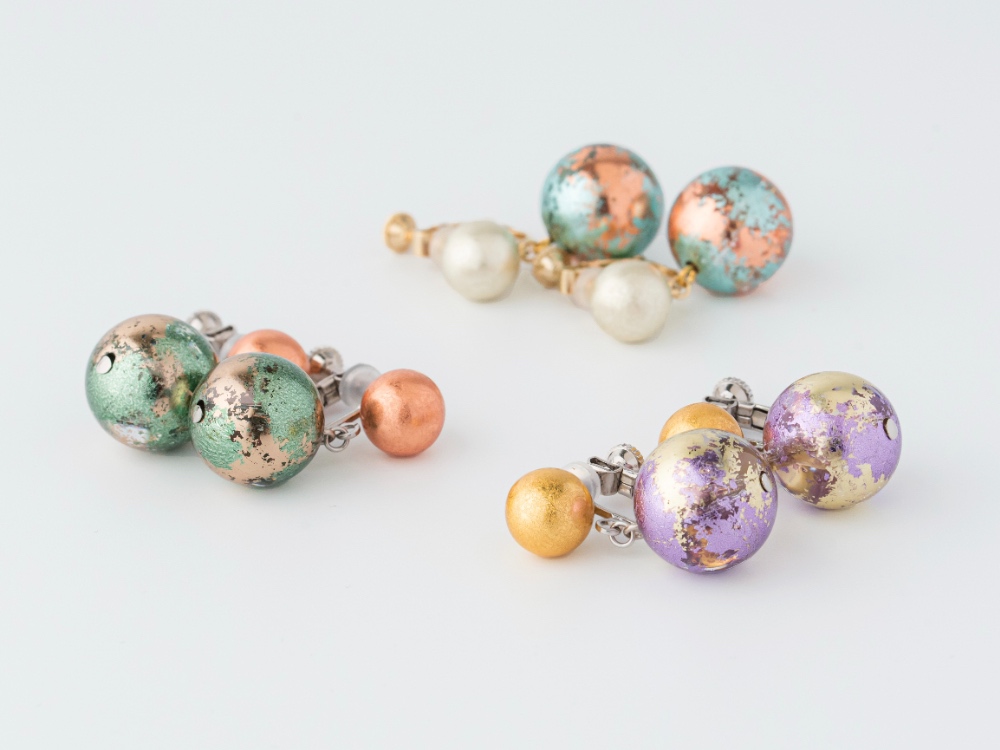 小さなアクリルの球にすべて丁寧に手作業で箔を施した「箔珠」は、それぞれの箔の色と上品な質感をさらに引き立てるよう、経年変化で自然に箔が剥がれたような、箔座オリジナルの「きれい寂び」加工が施されています。大小それぞれ箔の貼り方が異なり、2粒の箔珠の絶妙なコントラストと多彩な色合わせが日々を彩ってくれます。コロンとしたフォルムが可愛らしく、耳元で揺れるたびに色鮮やかな輝きを放つ特別なアクセサリーです。推し色の尊い輝きを身につけてライブに参戦するのはもちろん、日常生活の服装にも合わせやすいデザインとなっているほか、箔の経年変化も味わいのひとつとして楽しめるので、末永く愛用できるのも嬉しいです!