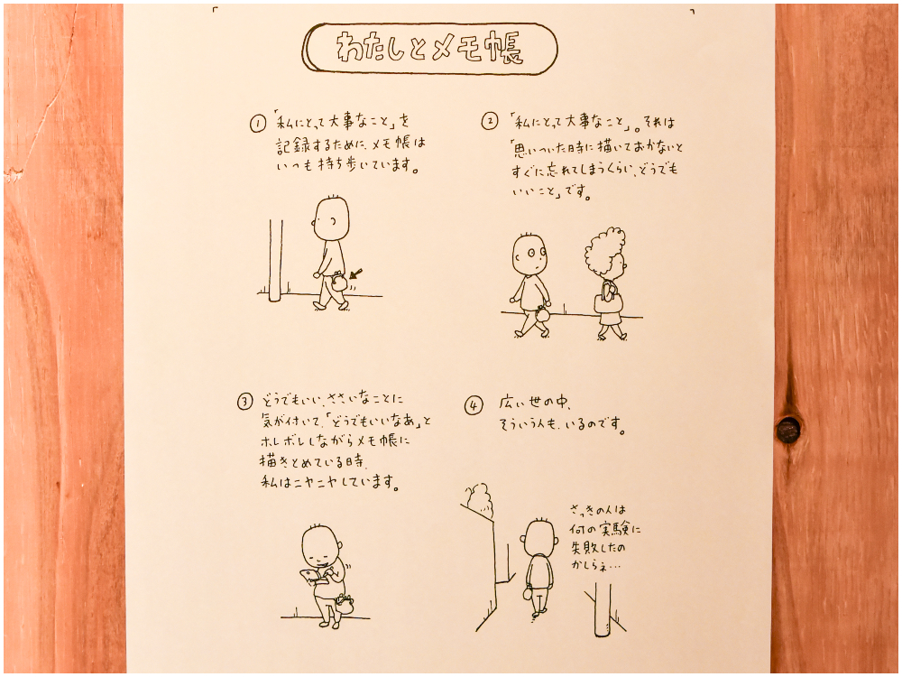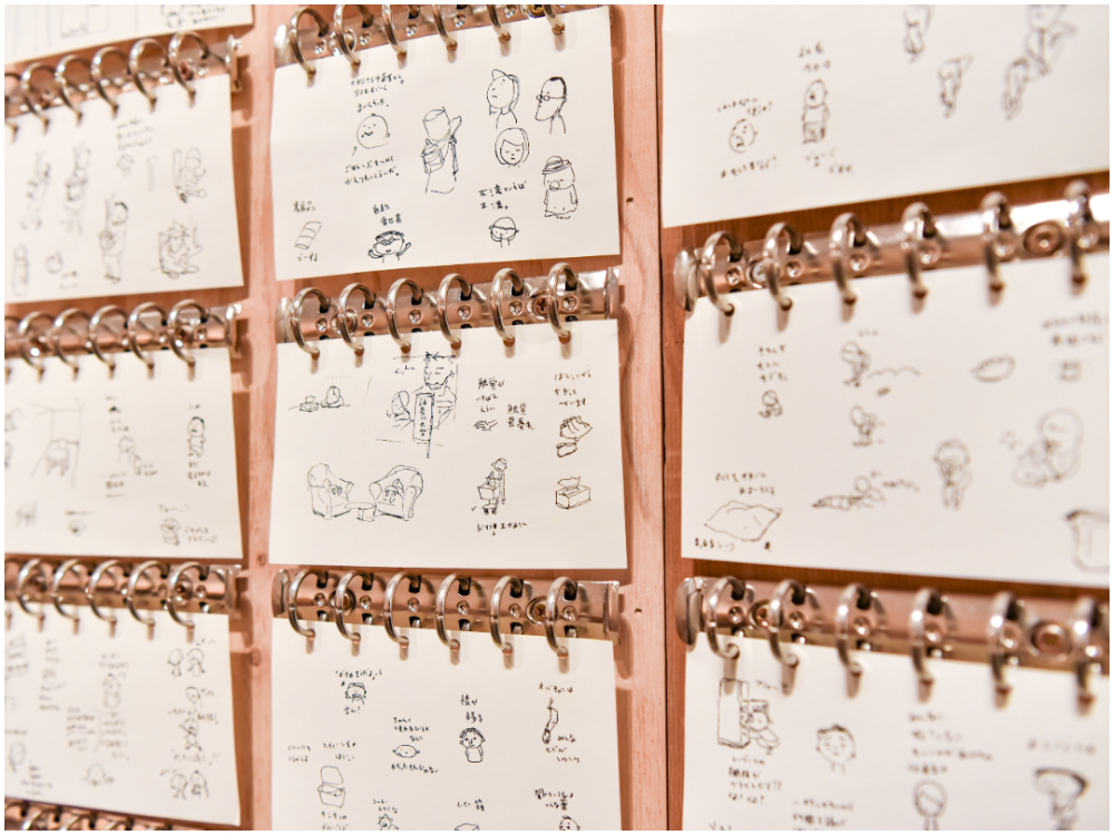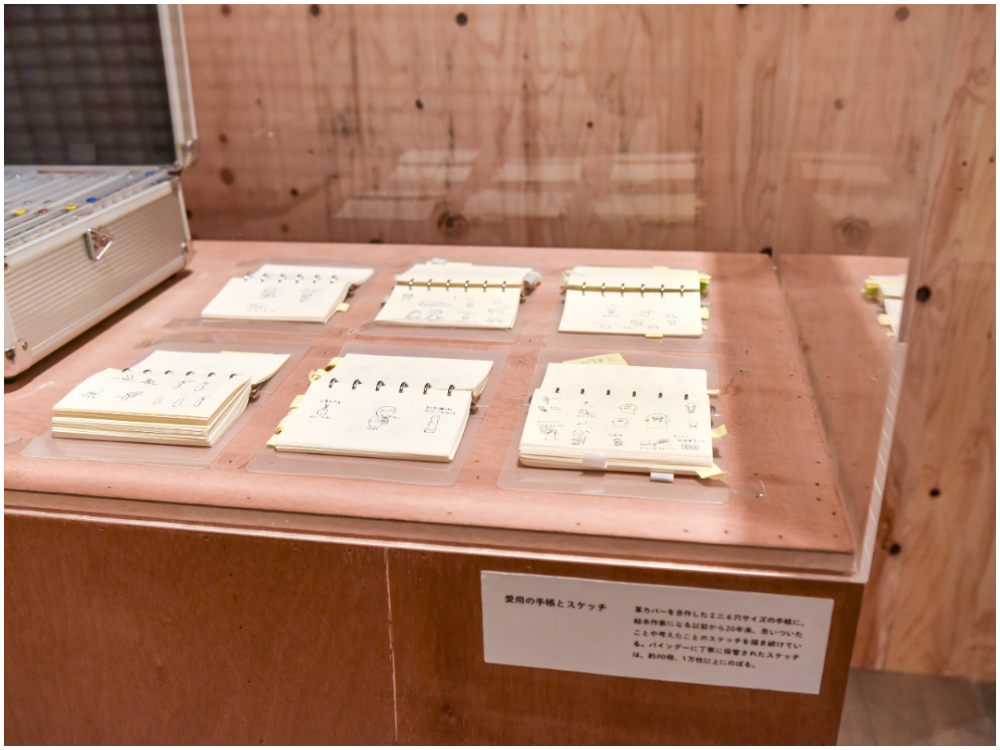 実際にヨシタケさんが描かれたスケッチも展示されています。愛用の小さな手帳に書き続けてきたスケッチは80冊、1万枚以上にのぼるとか。
