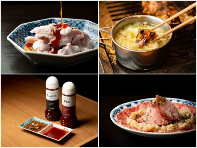 (写真_左上:ホルモン「アブラ」、右上:ホルモン専用ダレ、左下:誠のタレ(赤・黒)、右下:梅塩タン)