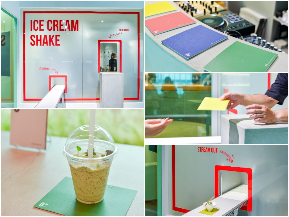最後に、印象的な注文口で、大人気の「OTM ICE CREAM」も注文してみました。レジカウンターで4色ある紙の中から好きな色を選び、裏でタイプ(アイス/シェイク)・ベース(バニラ/ソイミルク/マスカルポーネ/チョコレート)・マイクログリーンフレーバー(Spicy flavor MIX/Japanese MIX/Mild flavor MIX/Refreshing MIX)をそれぞれ選んで記入します。そして、表面にサインし、「ORDER HERE」の窓口に渡して注文完了です。出来上がった品がベルトコンベヤで運ばれてくるパフォーマンスも楽しかったですが、味の方がもっと衝撃を受けました。全体的に甘いのに、お野菜の爽やかな香りがして不思議な体験でした。「OTM ICE CREAM」はテイクアウトも可能なので、バスの待ち時間にもぜひ立ち寄ってくださいね。
