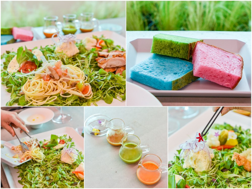 スマホからQRコードを読み込んで自分で注文できるので、じっくりメニューを眺めて選べるのも嬉しかったです。今回は内容盛りだくさんの看板メニュー「PREFIX OTM PLATE」を注文しましたが、最初の一皿から新鮮な体験の連続でした。目を惹く青・緑・ピンク色の塊の正体は、なんと食パンでした。鮮やかな色合いの自家製3色食パンは、ラズベリー・抹茶・リナブルーなど、植物由来の天然色素で着色しているそうです。味は普通の食パンとあまり変わらない気がしましたが、カラフルな食パンは初めてだったので、ウキウキしながらいただきました。