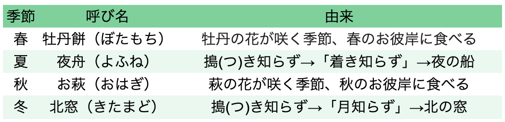 では次に、夏と冬の呼び名もみていきましょう。これらの呼び名は「おはぎの作り方」に由来します。おはぎの材料であるもち米は、お餅のように「ペッタンペッタン」とつくことはせず、すりこぎなどで半殺し(半つぶし)の状態にします。そのため、いつ搗(つ)いたのか分からないので「搗(つ)き知らず」となります。