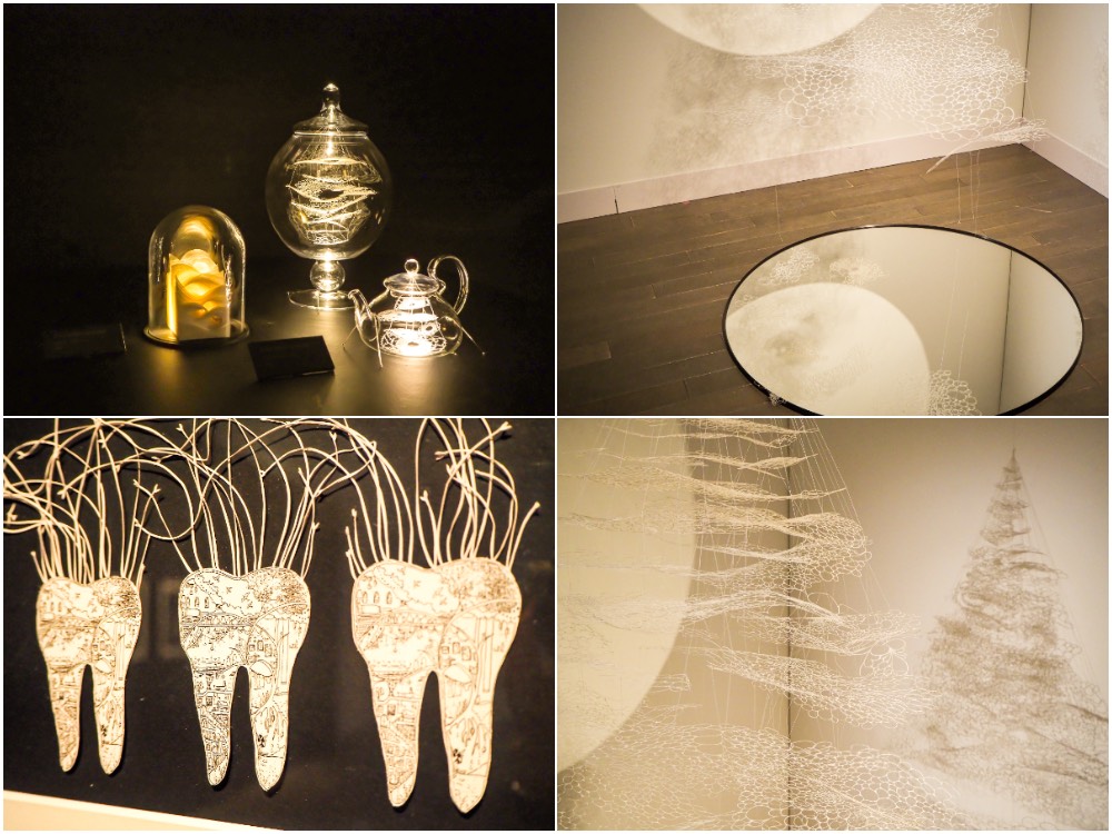 続いて、命たちの形成をイメージし、「地球」に焦点を当てた淡い光が届いているような作品や、小さい本の作品など、命の尊さや多様性を表現した作品が並びます。小さい本の作品はページの一枚一枚が全て異なり、一番多いものは108ページまで及んでいます。見えにくい中のページは、実は外より2倍以上の制作時間がかかったそうです。横の隙間から覗くと、洗濯物、トイレ、ワイングラスなどが細かく描かれており、その繊細さに思わず息を呑むでしょう。