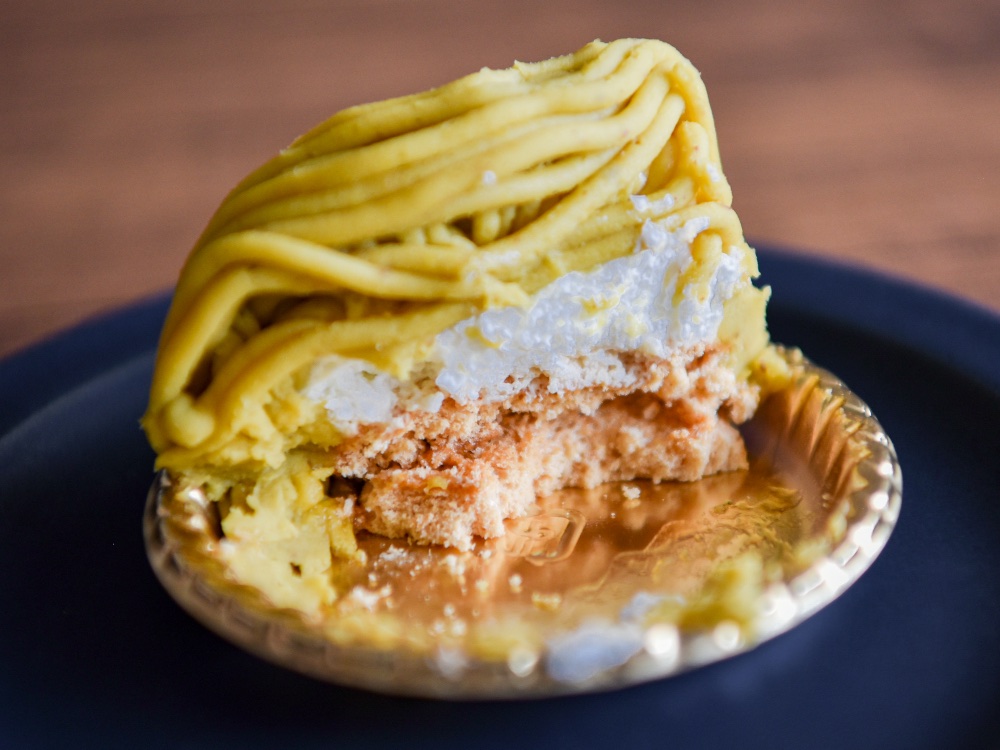 せっかくだから中身をきれいに見せようと、スプーンを入れたところ、柔らかさ故に潰れたかたちになってしまいましたが…この断面から、栗ペーストの濃厚さを実感いただけるはずです!100%生栗を使用しているこのモンブランは、本物の栗よりも美味しい!という声があるのも納得です。