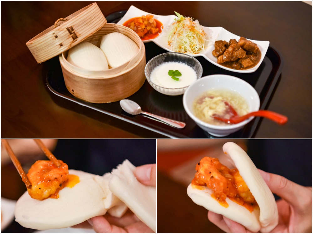 ランチセットで一番気になったのは、台湾バーガーの「割包(グァバオ)セット」です。蒸し立てのもちふわバンズ(中華まんの皮)に、特製の海老チリソースや中華風豚角煮を挟んで食べるかたちとなります。台湾では1枚の豚角煮や高菜の漬物、ピーナッツパウダーなどの具材が一般的ですが、『寿輝』では海老チリを挟んだ特別なバージョンが楽しめます。ちなみに、海老チリは日本発祥の中華料理なので、台湾や中国で見ることはおそらくないと思います。ここでしか出会えない、こだわりの創作中華料理のランチセットをぜひお試しください!