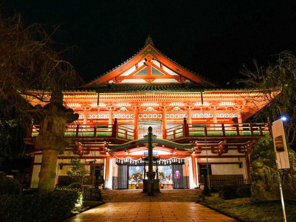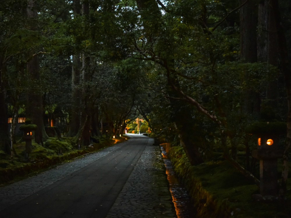 日が暮れる参道は、杉椿の樹林と石灯籠のやさしい灯火に包まれ、幽玄な雰囲気が漂います。