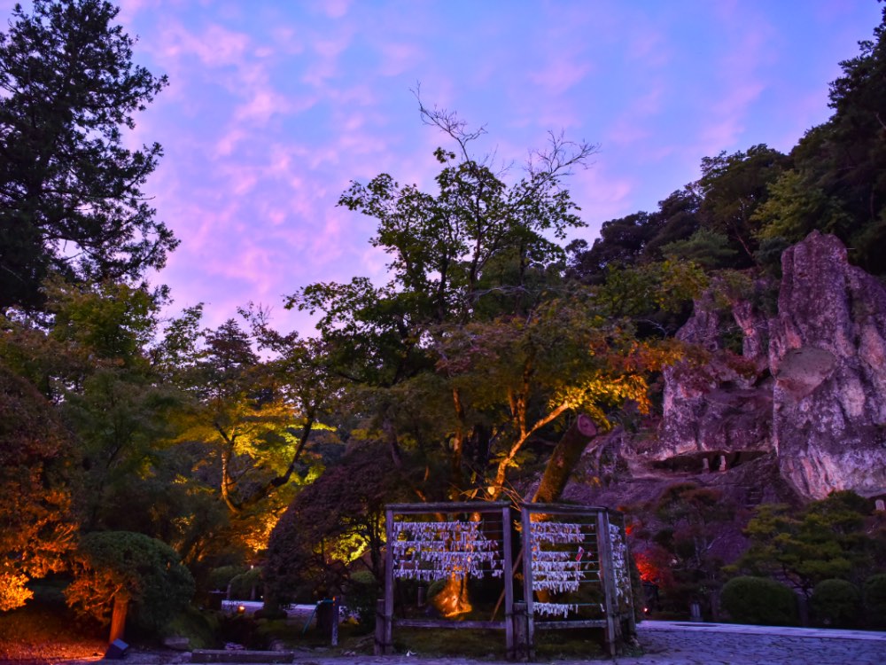 那谷寺の名所の一つ、「奇岩遊仙境(きがんゆうせんきょう)」は、独特な石の風景が広がります。光に照らされながら神秘的な雰囲気を醸し出し、夜になると更なる絶景が見られます。
