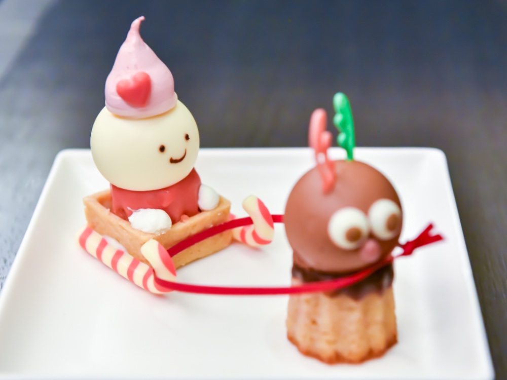 苺タルトとマドレーヌに、バニラムースとラズベリーのマシュマロから生まれた「トムテ」と、栗のフィナンシエとショコラムースの「ノエルトナカイ」。おふたりの行き先はどこ?