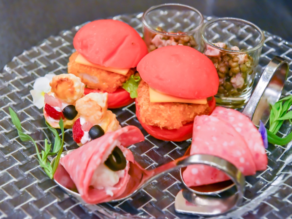 エビコロバーガーや、鴨のコンフィとレンズ豆のプティサラダのほか、シュゼットソーセージとポテトのブーケ仕立て、生ハムとベリーのヴォローヴァンなど、色鮮やかなセイボリーを眺めるだけで気分が上がりますね♪
