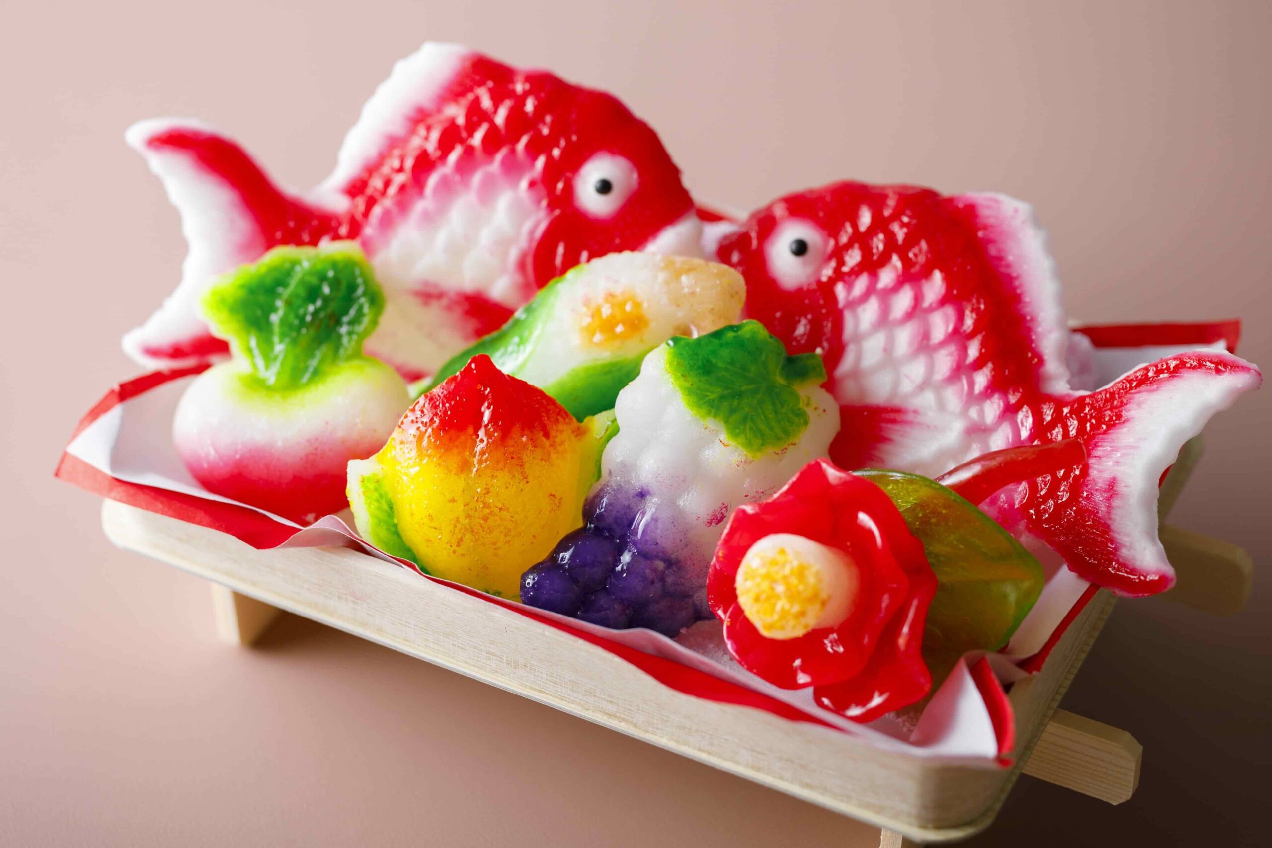 金花糖は、砂糖と水でできた日本の伝統的な砂糖菓子です。煮詰めた砂糖液を木型に流し込んで固めた後、食紅で彩色されます。