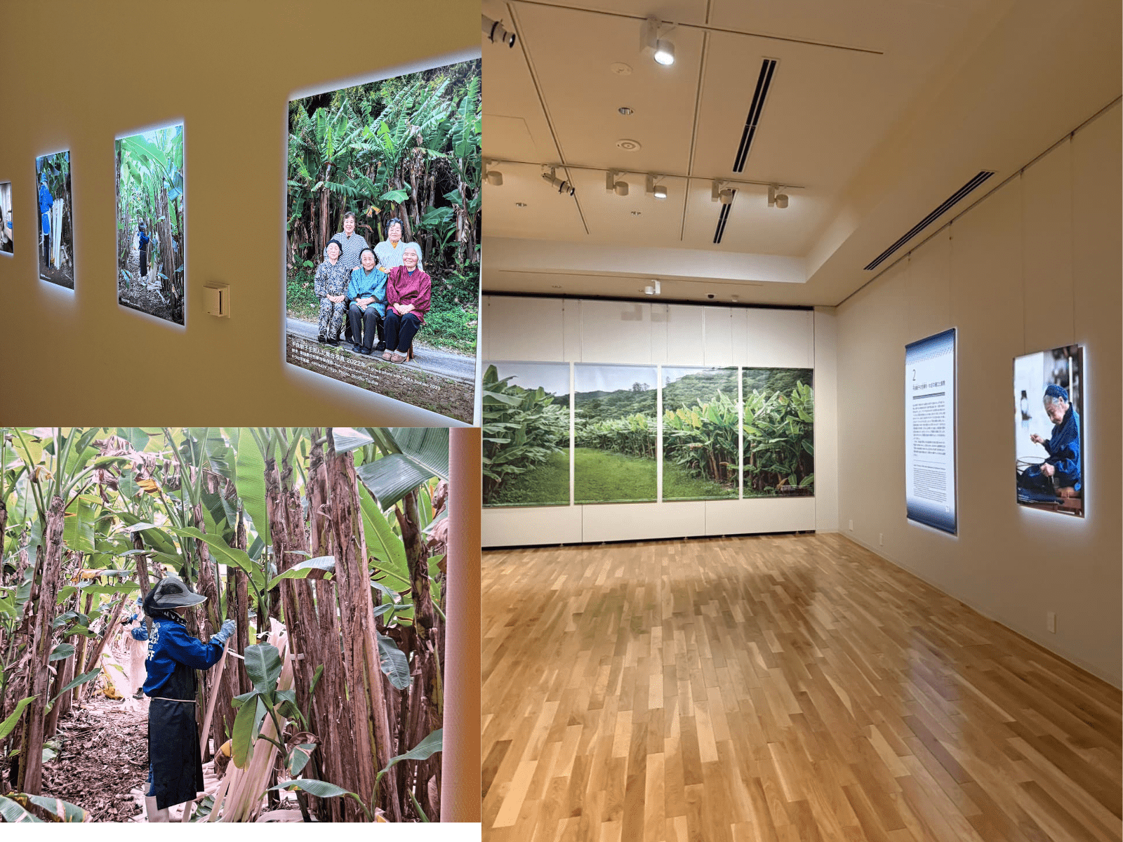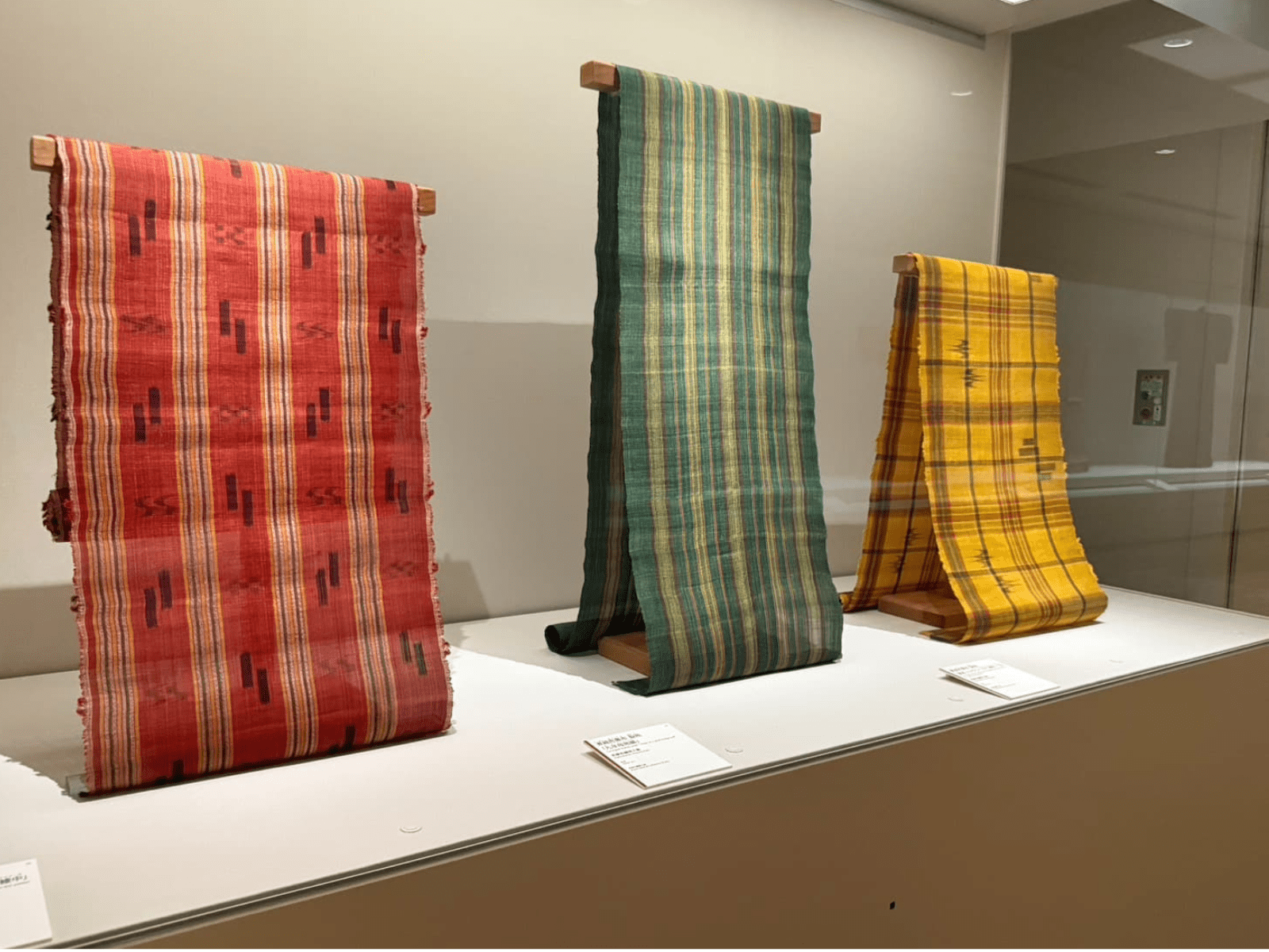最後の展示室「第3章 想いをつなぐ-芭蕉布のみらい」では、喜如嘉の芭蕉布保存会による伝承者養成事業の取り組みが紹介されていました。朱地に絣模様を重ねた着物は古典の力強さを残しつつも、どこかモダンで新鮮。平良さんが挑み続けた精神が、次の世代へとしっかり受け継がれているのを感じました。